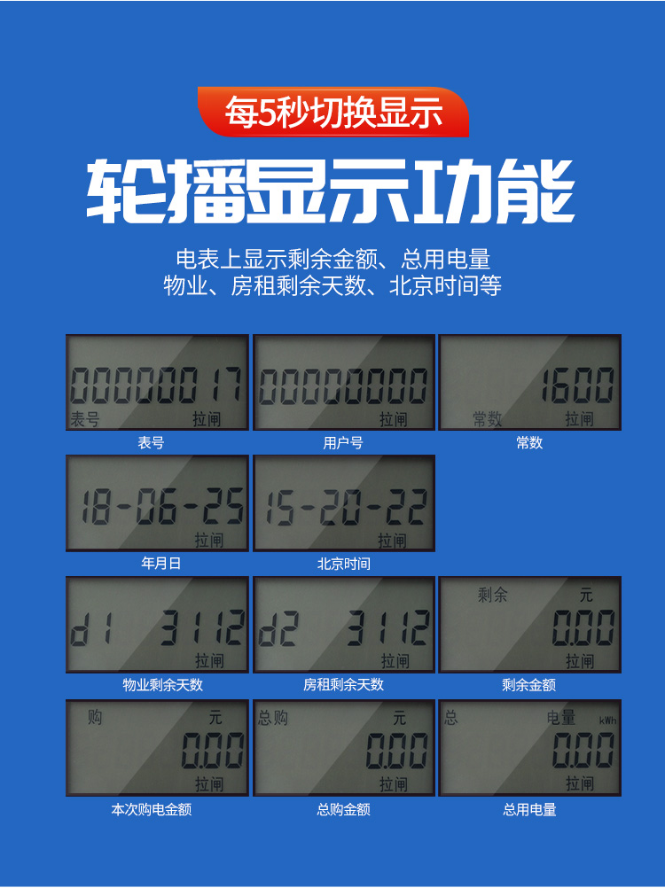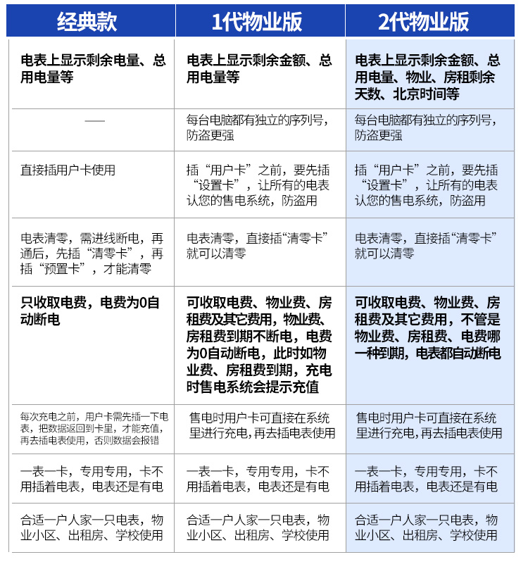 (2)預付費電表的功能:經典款電表是上顯示剩余電量、總用電量等,1代物業版電表上顯示剩余于金額、總用電量等,2代物業版電表上顯示剩余金額、總用電量、物業、房租剩余天數、北京時間等具體功能如下。