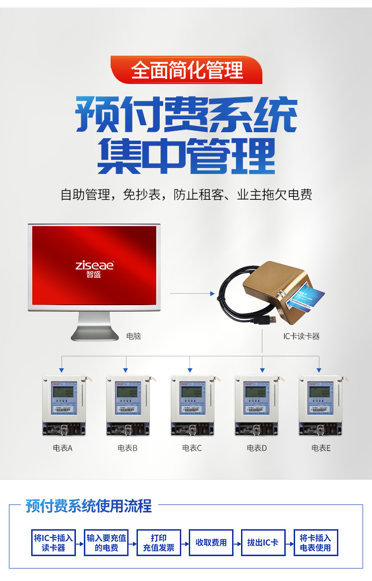(6)預付費電表的使用流程:1將IC卡插入讀卡器 2輸入要充值的金額 3電影充值發票 4收取費用 5拔出IC卡 6將IC卡插入電表使用,具體操作如下。