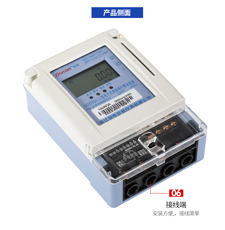 (9)電能表外形和接線方式,接線:第一孔柱進火線和第二孔柱出火線,第三孔柱進零線和第四孔柱出零線